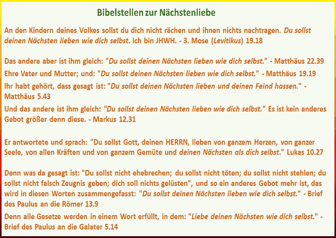 "liebe deinen nächsten wie dich selbst." dies sei das zweite gebot von gott für die menschen, den ersten, der liebe zu gott gleich. Es kann der nachbar sein, die kassiererin im supermarkt, der arbeitskollege oder der chef. Hier ist die bibel deutlich, mit der zentrale punkt des christentums.. Das wort nächstenliebe wird ganz besonders oft im judentum und christentum verwendet.